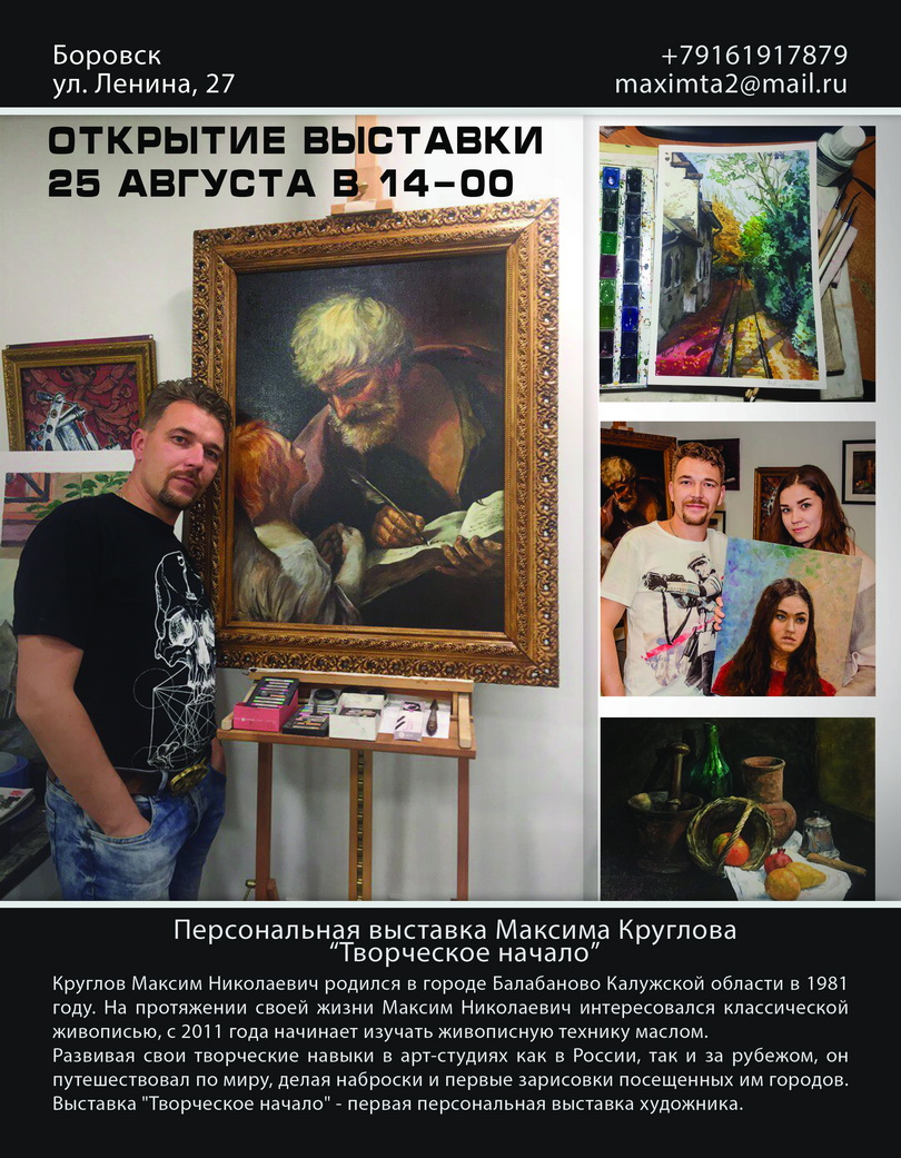 25 августа в Боровске состоится открытие персональной выставки Максима Круглова «Творческое начало».