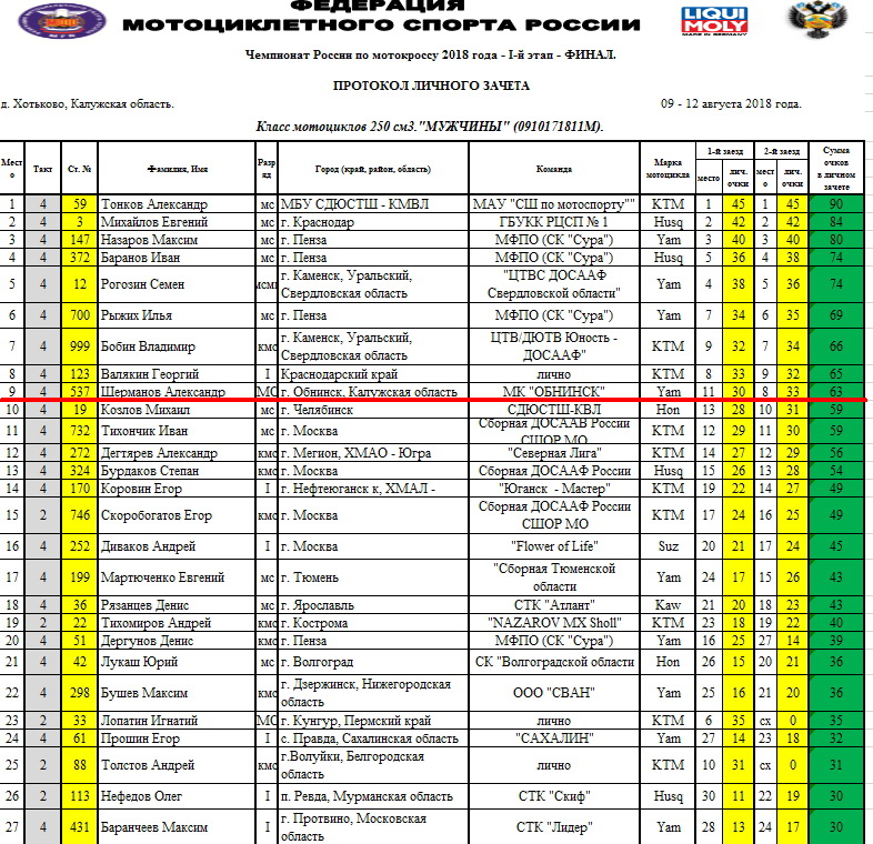 Мастер спорта из Обнинска Александр Шерманов по сумме двух заездов в классе 250 см³ занял 9-ю позицию.