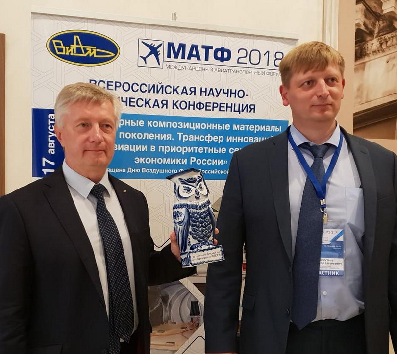 Конференция «Полимерные композиционные материалы нового поколения. Трансфер инноваций из авиации в приоритетные сектора экономики России» прошла под эгидой ВИАМ в рамках V Международного авиатранспортного форума МАТФ-2018. Заместителю генерального директора ОНПП «Технология» по науке и развитию Олегу Комиссару за лучший доклад вручен приз — статуэтка совы, символизирующая мудрость и знания.