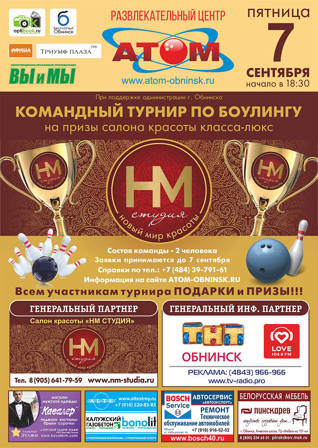 Заявку для участия Вашей команды в турнире по боулингу необходимо сделать на ресепшн Боулинг-центра «Атом»!