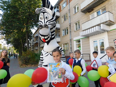 Праздничное настроение у пешеходного перехода на Треугольной площади создавала ростовая кукла Зебра Марти, которая всегда является символом подобных мероприятий.