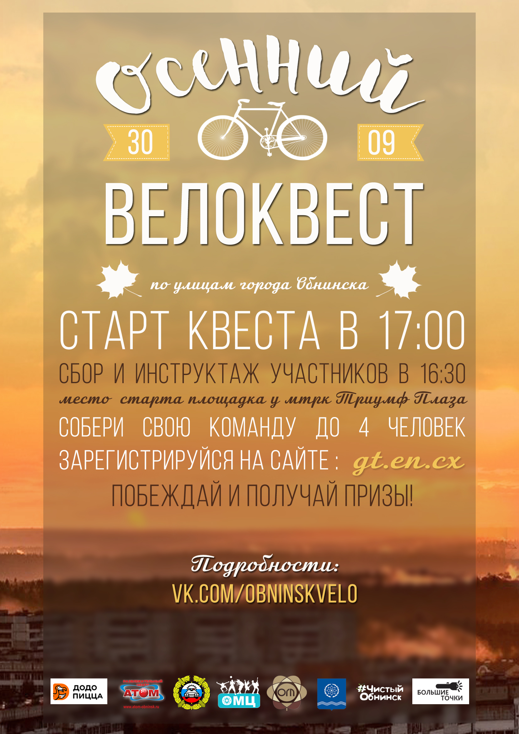 Обнинский молодежный центр приглашает всех любителей велоспорта провести активно свои выходные и принять участие в «Осеннем велоквесте», который состоится 30 сентября 2018 года.