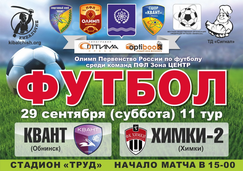 29 сентября, в субботу, в 15-00 обнинский СК «Квант» играет на стадионе «Труд» с ФК «Химки-М» в матче 11 тура ОЛИМП-Первенства России по футболу среди команд клубов ПФЛ (второй дивизион, Зона «Центр»).