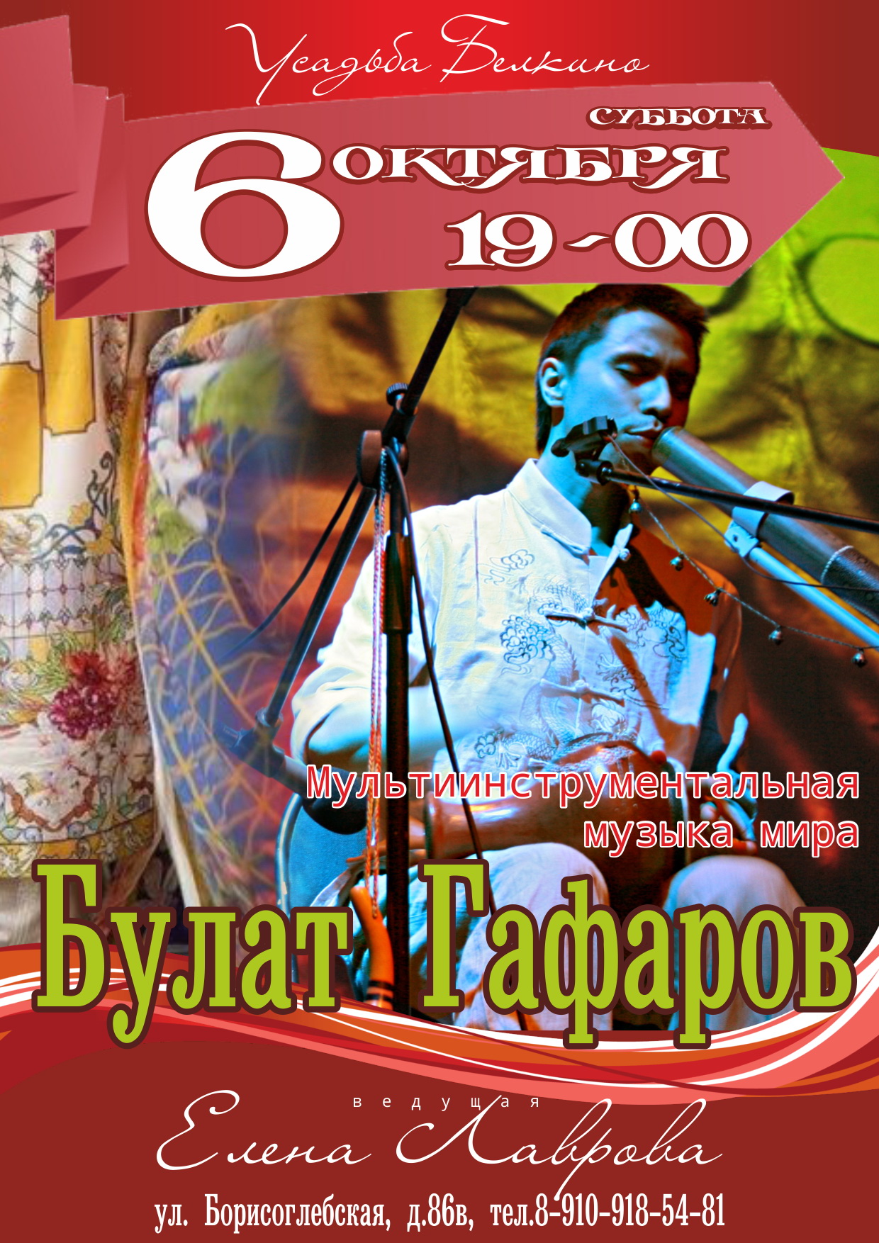Музыкальная гостиная Усадьбы Белкино приглашает на мультиинструментальное этно-шоу Булата Гафарова, которое откроет восьмой творческий сезон.