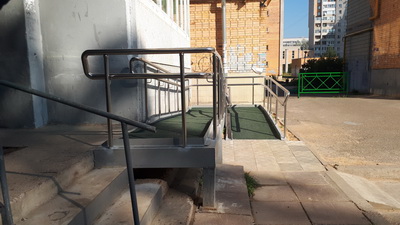 В комиссионной приемке готовых пандусов принимает участие специалист отдела по работе с населением и развитию местного самоуправления Администрации города Дмитрий Миронов, который сам является инвалидом-колясочником.
