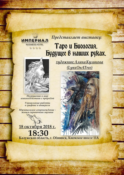 18 октября в Бизнес-отеле «Империал» пройдет творческий вечер из серии «А жизнь прекрасна!». Вниманию горожан будут представлены работы молодого художника Алины Куликовой с выставкой «Таро и биология. Будущее в наших руках.»