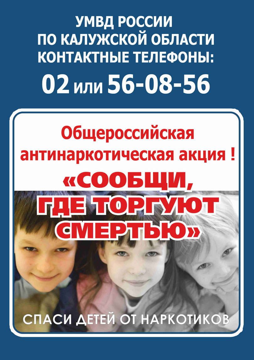 С 12 по 24 ноября жители региона могут сообщить по номеру 02 и «телефону доверия» (4842) 56-08-56 информацию о фактах распространения наркотиков и вовлечения несовершеннолетних в преступную деятельность, а также о причастных к пропаганде наркопотребления интернет-сайтах. По указанным номерам телефонов калужанам будут предоставляться консультации и квалифицированная помощь в вопросах лечения и реабилитации наркозависимых лиц. Анонимность и конфиденциальность гарантируется.