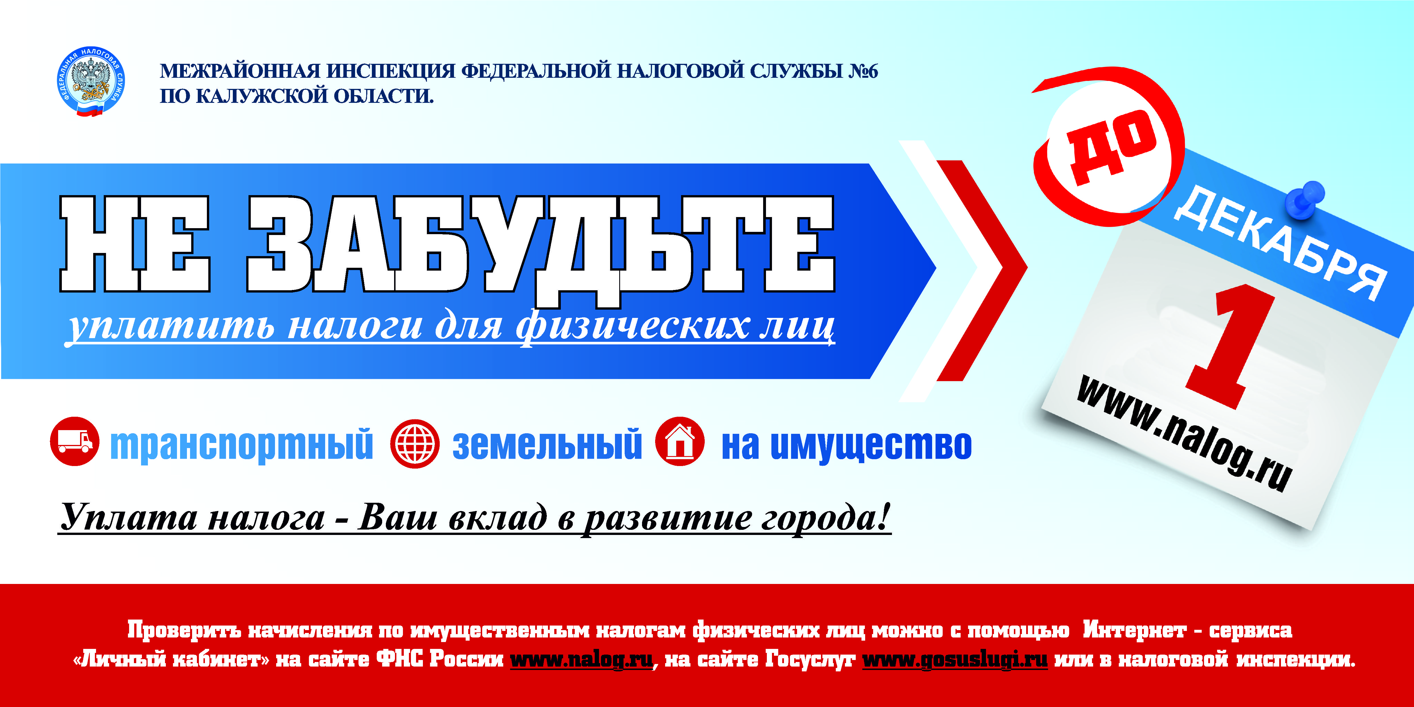 Межрайонная инспекция Федеральной налоговой службы №6 по Калужской области напоминает о необходимости уплаты налогов для физических лиц до 1 декабря: