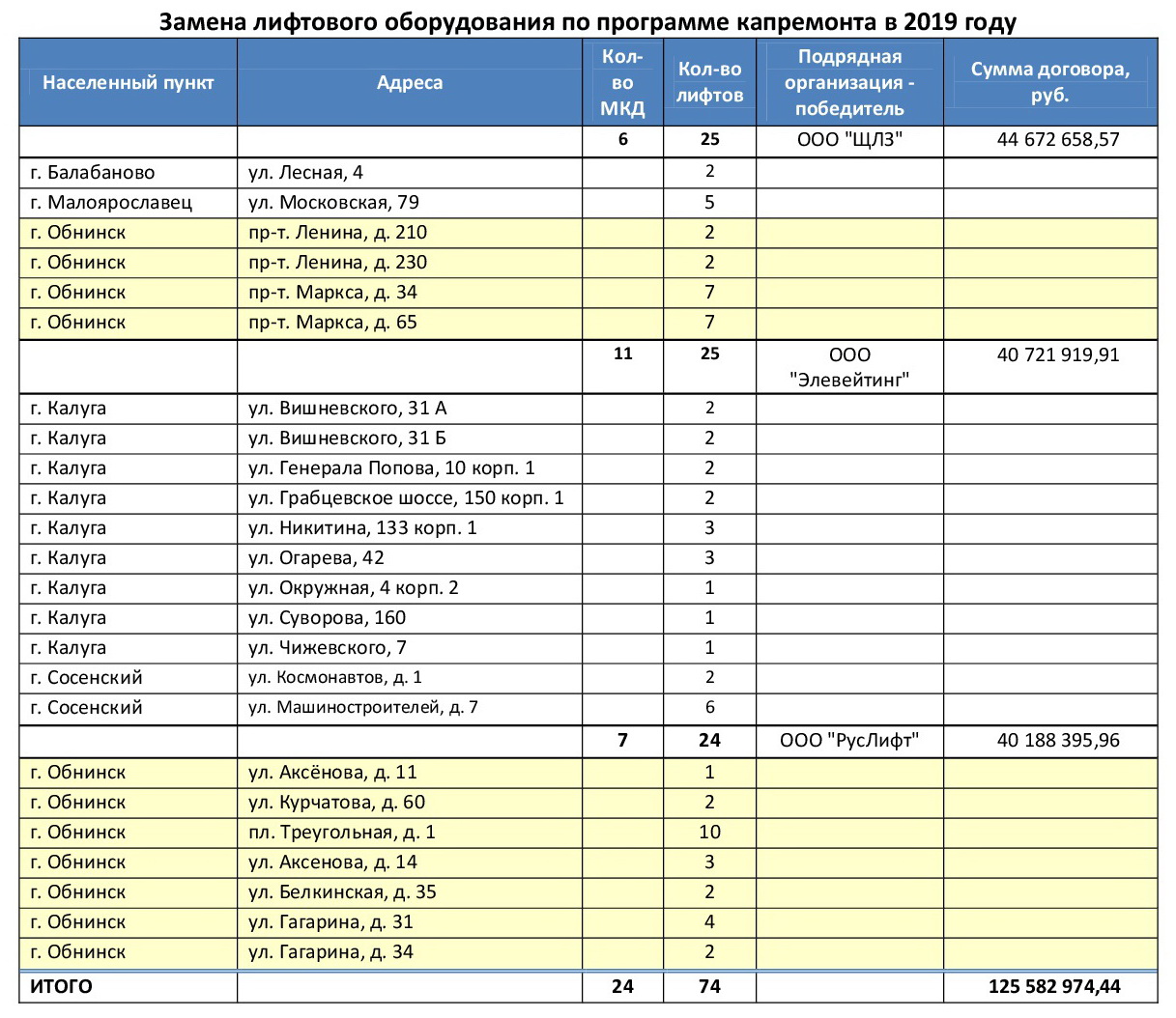 Это работы по замене лифтового оборудования в многоквартирных домах городов Калуги и Обнинска, а также в Боровском, Козельском и Малоярославецком районах.
