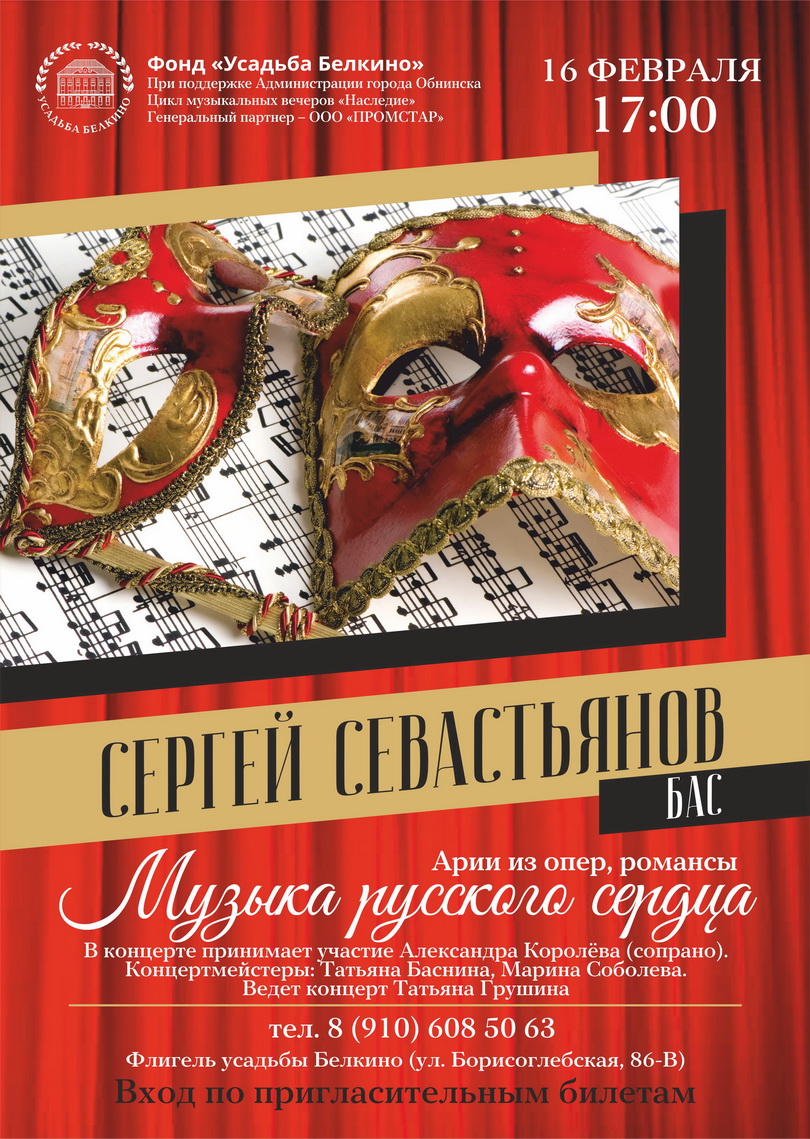 Приглашаем горожан 16 февраля на очередной музыкальный вечер из цикла «Наследие». Программа «Музыка русского сердца» представляет классические романсы и арии из опер русских композиторов. Выступает Сергей Севастьянов (бас), экс- солист Львовского оперного театра. В концерте участвует Александра Королёва (сопрано), студентка Московской консерватории. Концертмейстеры Татьяна Баснина и Марина Соболева. Ведущая Татьяна Грушина.