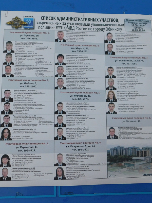 На одном из заседаний Общественного совета при начальнике ОМВД России по г. Обнинску Сергее Воронежском, на котором обсуждалась работа участковых уполномоченных полиции, представителем совета Юрием Орешонковым было инициировано и рассмотрено предложение о подготовке информационных плакатов с указанием административных участков участковых уполномоченных полиции.