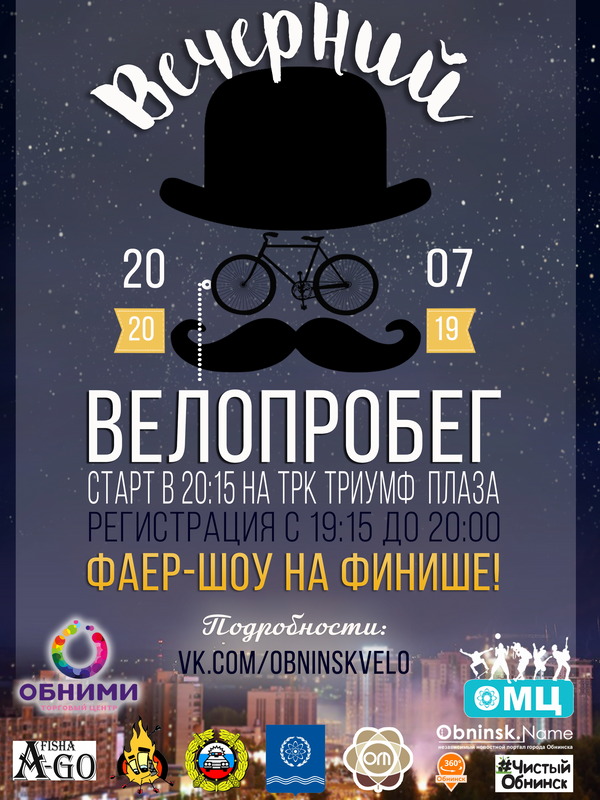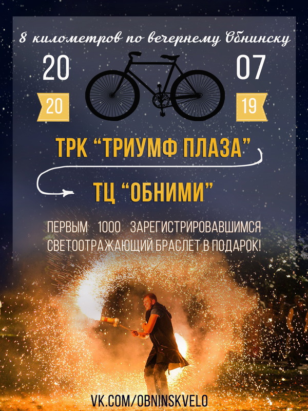 Всех любителей велопрогулок организаторы ждут на площадке у МТРК «Триумф Плаза» 20 июля, чтобы вместе проехать 8 километров по вечернему Обнинску. На финише участников велопробега ожидает грандиозное фаер-шоу.