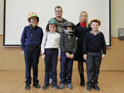 Ученикам не только напомнили о важности соблюдения правил поведения на дороге и об опасностях, которые могут подстерегать их при невнимательности перехода через проезжую часть, но и показали, как менялись мотоциклетные шлемы на протяжении многих лет.