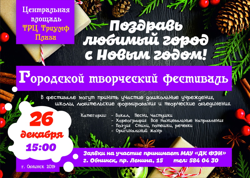 Для участия в фестивале необходимо предоставить заявку до 23 декабря на электронный адрес: dk-fei-obninsk@yandex.ru или в Дом культуры ФЭИ (пр.Ленина, 15), тел./ факс (8484)584-04-30.