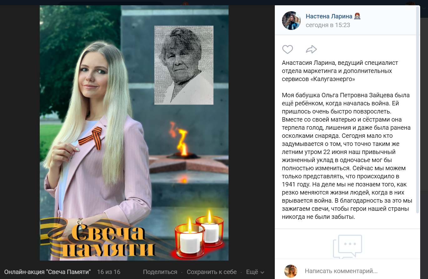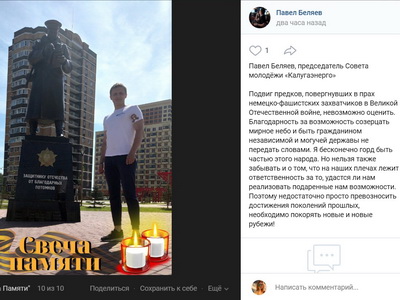 «22 июня 1941 года фашистская Германия напала на СССР. В этот день началась война, которая унесла 27 миллионов жизней советских солдат. По традиции в эту трагичную дату мы зажигаем свечи в память о погибших защитниках Родины. В этом году, хоть и виртуально, мы не упустили возможность вспомнить каждого героя», - рассказал председатель Совета молодёжи «Калугаэнерго» Павел Беляев.