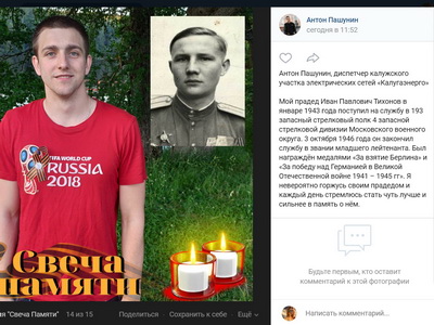 «Мой прадед Иван Павлович Тихонов в январе 1943 года поступил на службу в 193 запасный стрелковый полк 4 запасной стрелковой дивизии Московского военного округа. 3 октября 1946 года он закончил службу в звании младшего лейтенанта. Был награждён медалями «За взятие Берлина» и «За победу над Германией в Великой Отечественной войне 1941 – 1945 гг. Я невероятно горжусь своим прадедом и каждый день стремлюсь стать чуть лучше и сильнее в память о нём», - написал под фотографией своего героя диспетчер калужского участка электрических сетей Антон Пашунин.