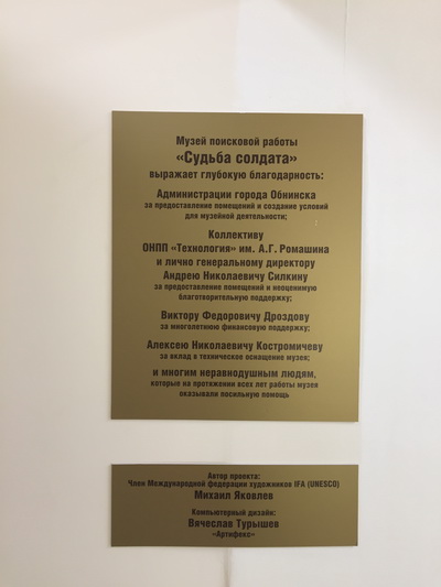 Неоценимую поддержку музею оказал Андрей Силкин. ОНПП «Технология» предоставило дополнительные площади - под первый зал, были проведены ремонтные работы помещений и оказана спонсорская помощь при создании экспозиции. Владислав Шапша поблагодарил Андрея Николаевича за содействие, а тот, в свою очередь, произнес теплые слова в адрес Галины Слесаревой: «Этот музей посвящен памяти Великой Отечественной войны. Он придуман и создан руками женщины, которая трепетно относится к своему делу. Галина – очень порядочный, ответственный человек, большой патриот и большой друг не только нашего предприятия, но и Госкорпорации «Ростех».