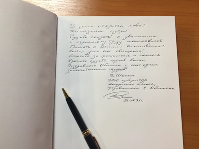 После экскурсии Карина Башкатова рассказала о впечатлении от экспозиции и огромного труда тех, кто ее создавал. Она вручила Благодарственные письма Галине Слесаревой и Андрею Силкину от Администрации города, а Владислав Шапша оставил первую запись в Книге Почетных гостей.