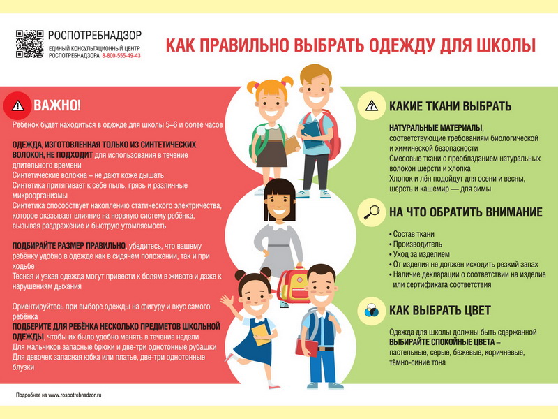 В преддверии нового учебного года Роспотребнадзор напоминает, что в первую очередь одежда для школы должна обеспечить сохранение детского здоровья. Родителям при приобретении школьной одежды для ребёнка важно помнить, что в ней он будет проводить 5-6 и более часов. В связи с этим, необходимо понимать, что одежда для школы, которая состоит только из синтетических волокон для этих целей не подойдет. Следует выбирать смесовые ткани с небольшим содержанием синтетических волокон.