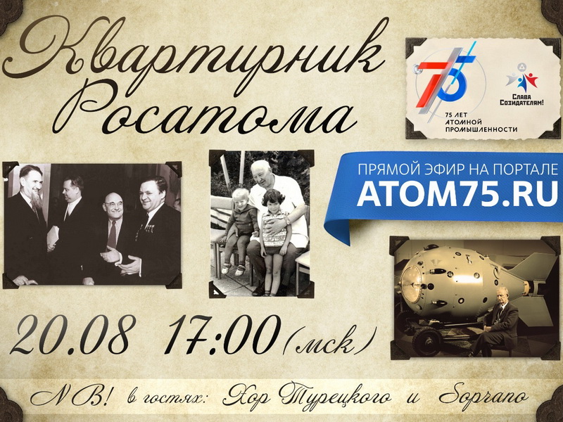 20 августа в 17-00 (по московскому времени) – в день рождения отечественного атомпрома – на онлайн-площадке atom75.ru состоится большой “Квартирник Росатома” для всех работников атомной промышленности, ветеранов отрасли, их семей, жителей атомных городов и ЗАТО. В прямом эфире будут выступать «Хор Турецкого» и арт-группа Soprano.