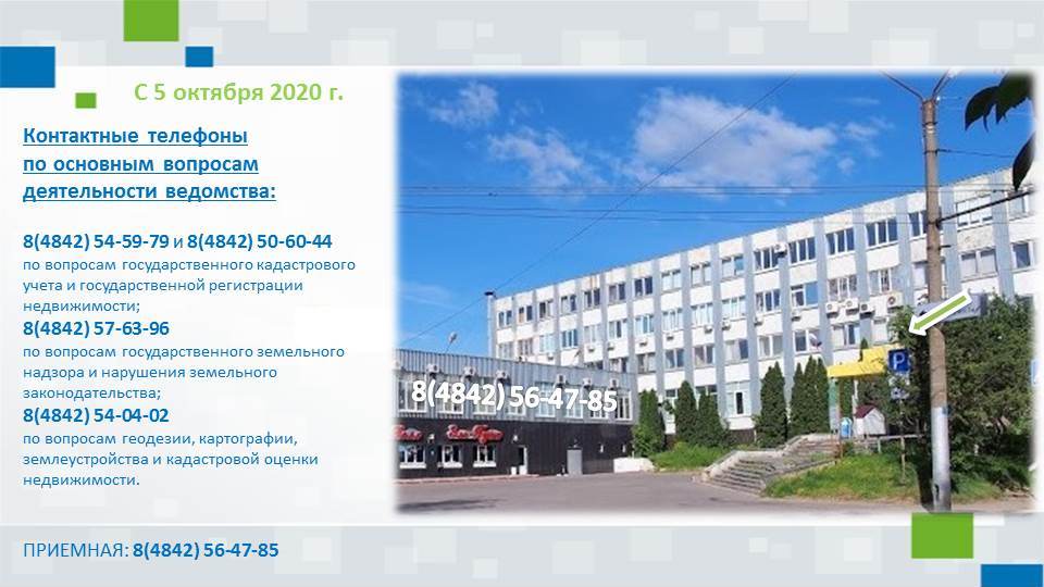 - 8(4842) 54-59-79 и 8(4842) 50-60-44 - по вопросам государственного кадастрового учета и государственной регистрации недвижимости;