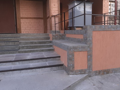 Вначале был проведен демонтаж разрушенного бетонного подиума крыльца входной группы, установка опалубки и сварка армирования. Затем - заливка бетона в опалубку с равномерным распределением при помощи вибратора по бетону. Выложен красный кирпич, сварен каркас по периметру «лавки» крыльца и залит бетоном. Произведен демонтаж металлических перил и опалубки. Оштукатурены поверхности стен штукатуркой «Короед», установлены и окрашены перила, установлен пандус.