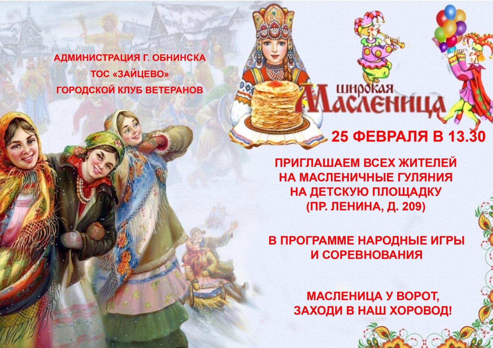 Уважаемые жители и гости города Обнинска, поздравляем всех с началом масленичной недели и приглашаем на праздничные мероприятия, которые подготовили для Вас организации культуры и ТОС города.