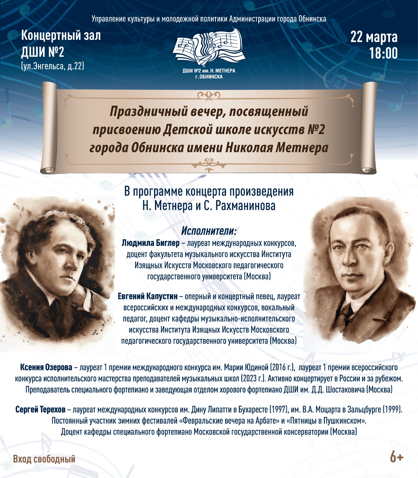 22 марта в 18:00 состоится праздничный концерт, посвящённый присвоению имени Николая Метнера Детской школе искусств № 2 города Обнинска.