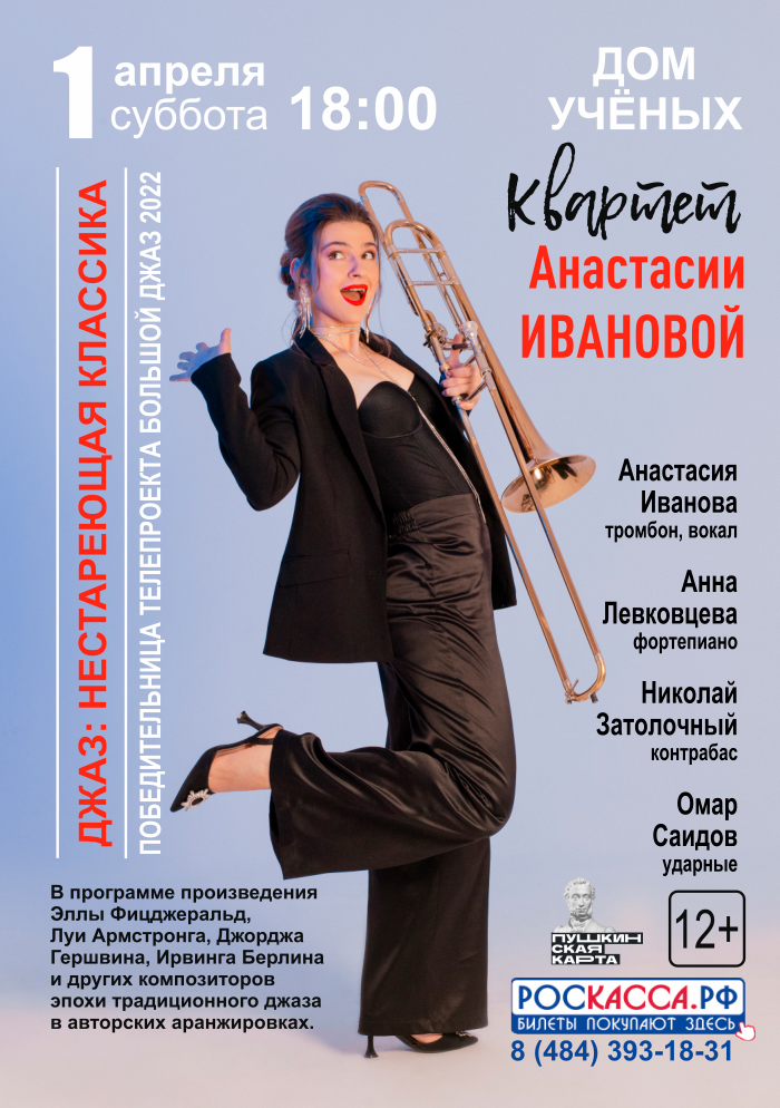 1 апреля в 18:00 в Доме ученых состоится концерт квартета Анастасии Ивановой «Джаз: нестареющая классика» (12+).