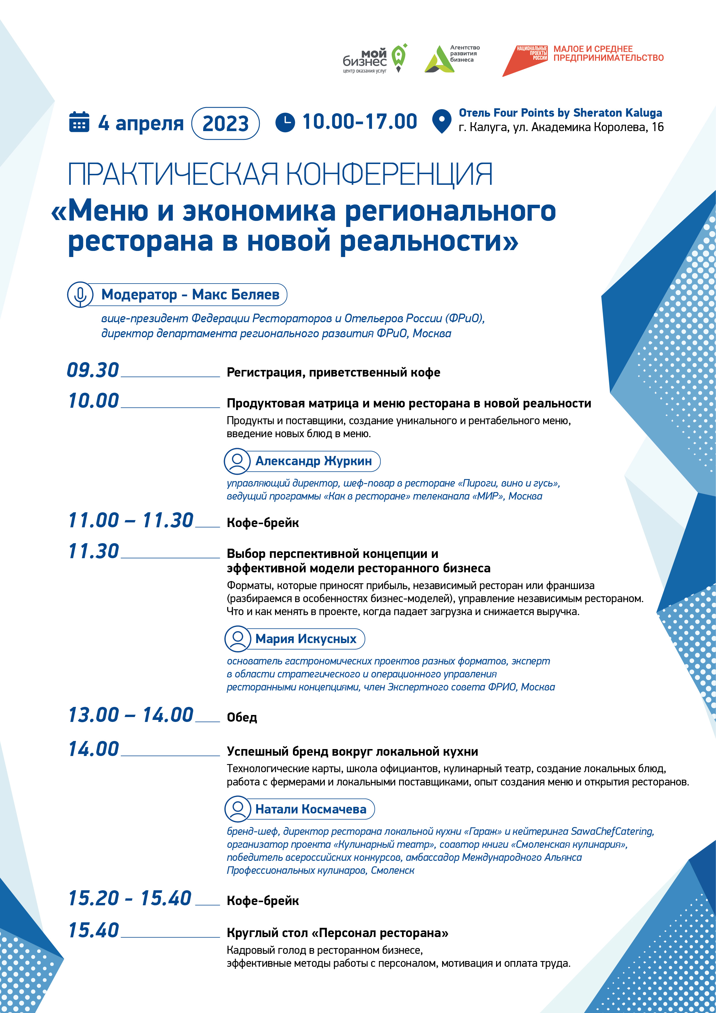 Модератором встречи выступит Макс Беляев – вице-президент Федерации Рестораторов и Отельеров России (ФРиО), директор департамента регионального развития ФРиО (г. Москва).