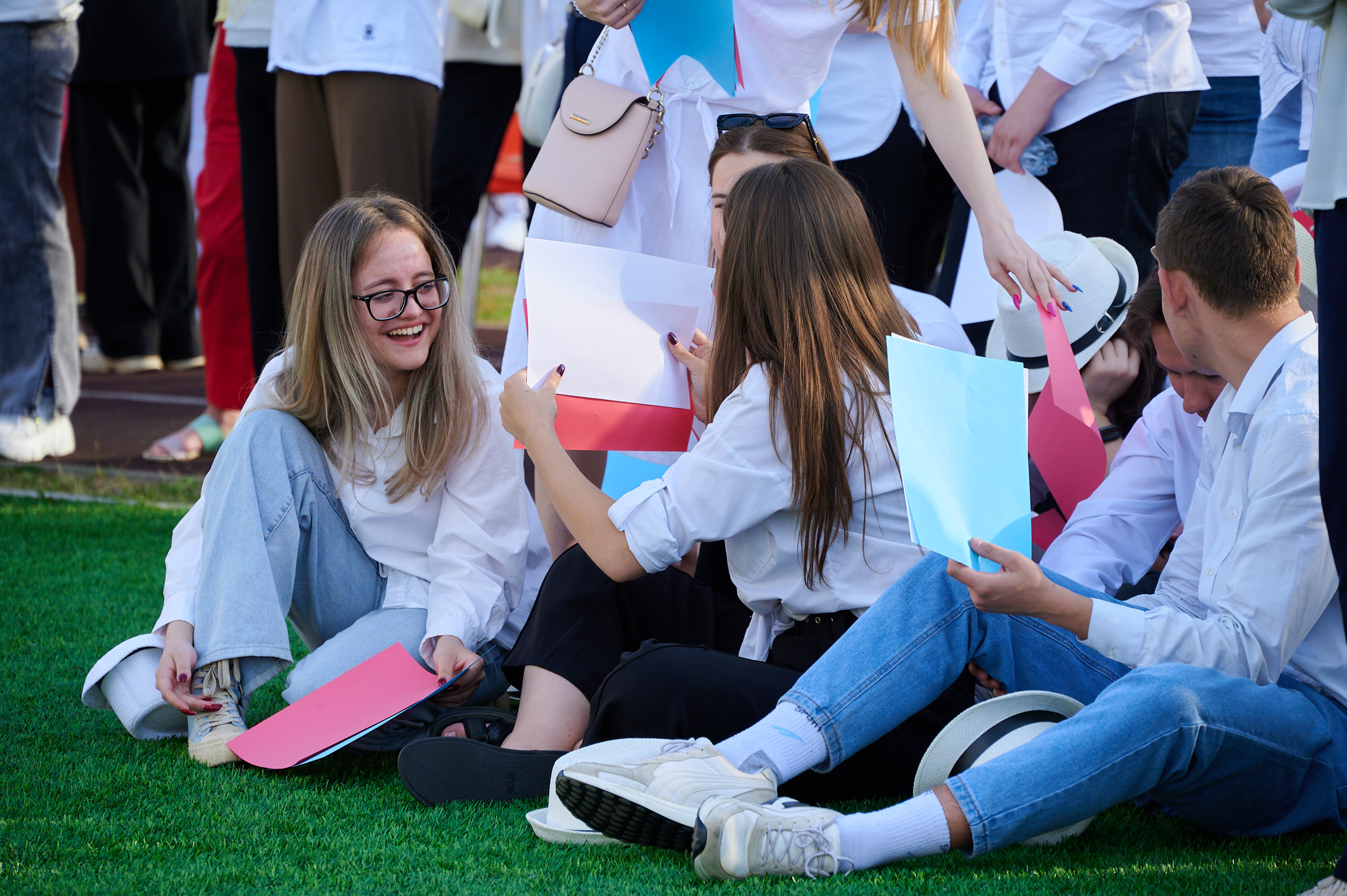 Не обошлось и без флешмоба: выпускники с помощью белых, синих и красных листков пустили «волну», а потом вместе развернули огромный триколор, который в такт музыке развевали на ветру. И хоть здесь собрались ребята из разных школ, но общий перфоманс однозначно их сблизил и объединил.