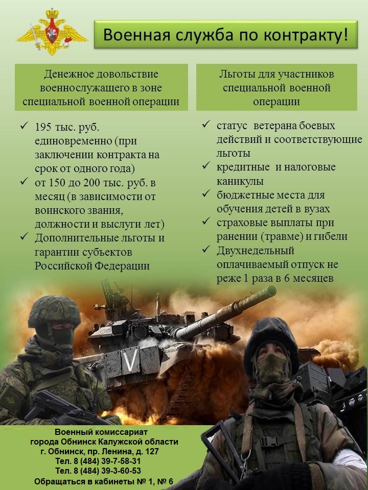 Пункт отбора на военную службу по контракту работает в военном комиссариате города Обнинска по адресу: пр. Ленина, 127. Телефоны: 8 484 39 32577, 8 484 39 75831.