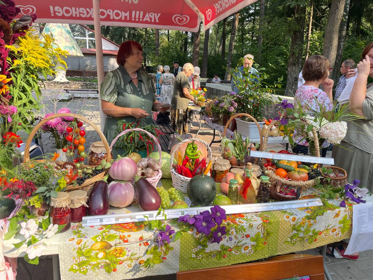 На столах можно было увидеть гигантские овощи (помидоры причудливых форм и сортов, кабачки, перцы, баклажаны), спелые фрукты, сочные ягоды и яркие цветочные композиции. Кто-то подошел к вопросу творчески и представил гостям флористику своего сада в виде картин из цветочного гербария.