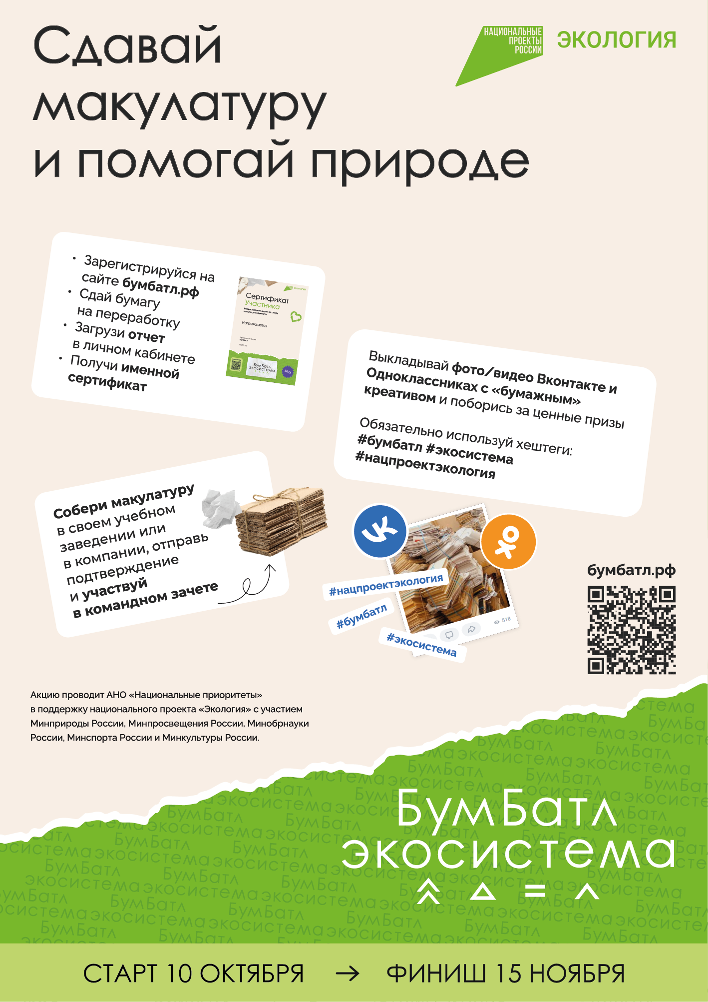 Стартовал четвертый сезон акции «БумБатл». В этом году масштабный экологический проект организован АНО «Национальные приоритеты» совместно с Всероссийским экологическим общественным движением «Экосистема». Ключевая цель акции – сокращение излишнего потребления бумаги, организация системы ее переработки и формирование экологической культуры.