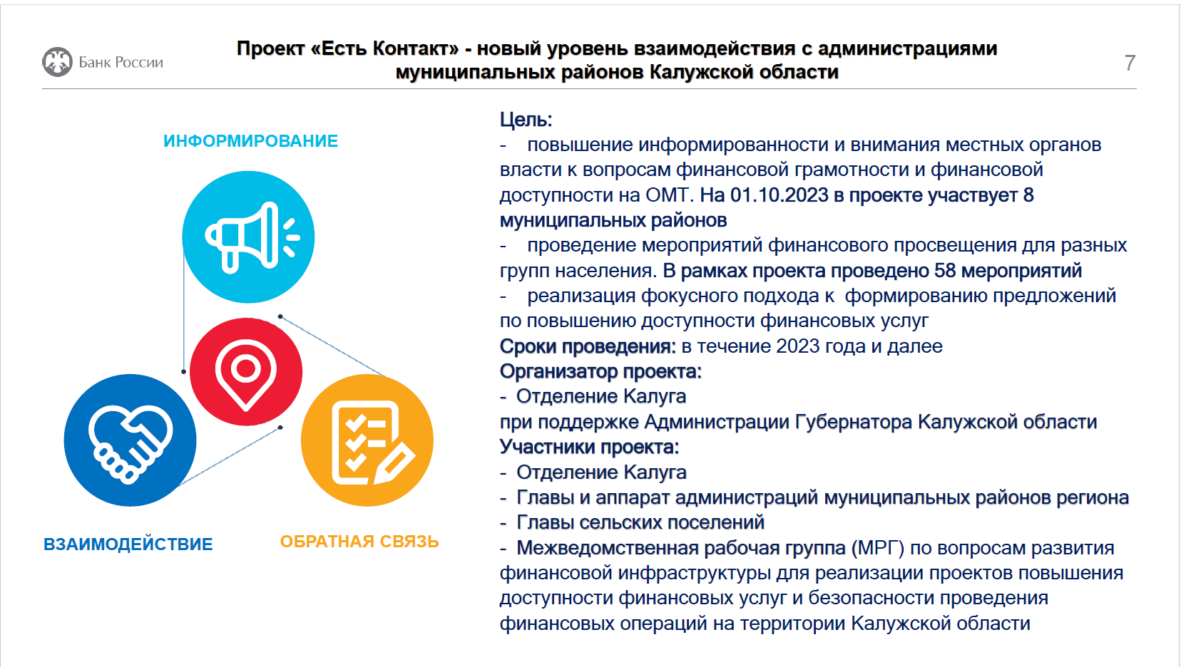 Дополнительным инструментом повышения финансовой доступности является проект «Есть контакт». В его рамках калужское отделение Банка России взаимодействует с главами районов и сельских поселений в целях выявления конкретных потребностей и обеспечения жителей наиболее востребованными финансовыми услугами и цифровыми сервисами.