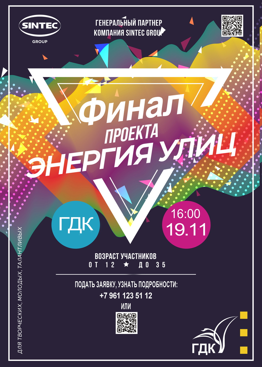 19 ноября в 16:00 в Городском Дворце Культуры состоится финал молодежного, патриотического проекта «Энергия улиц» для детей и молодежи (12+).