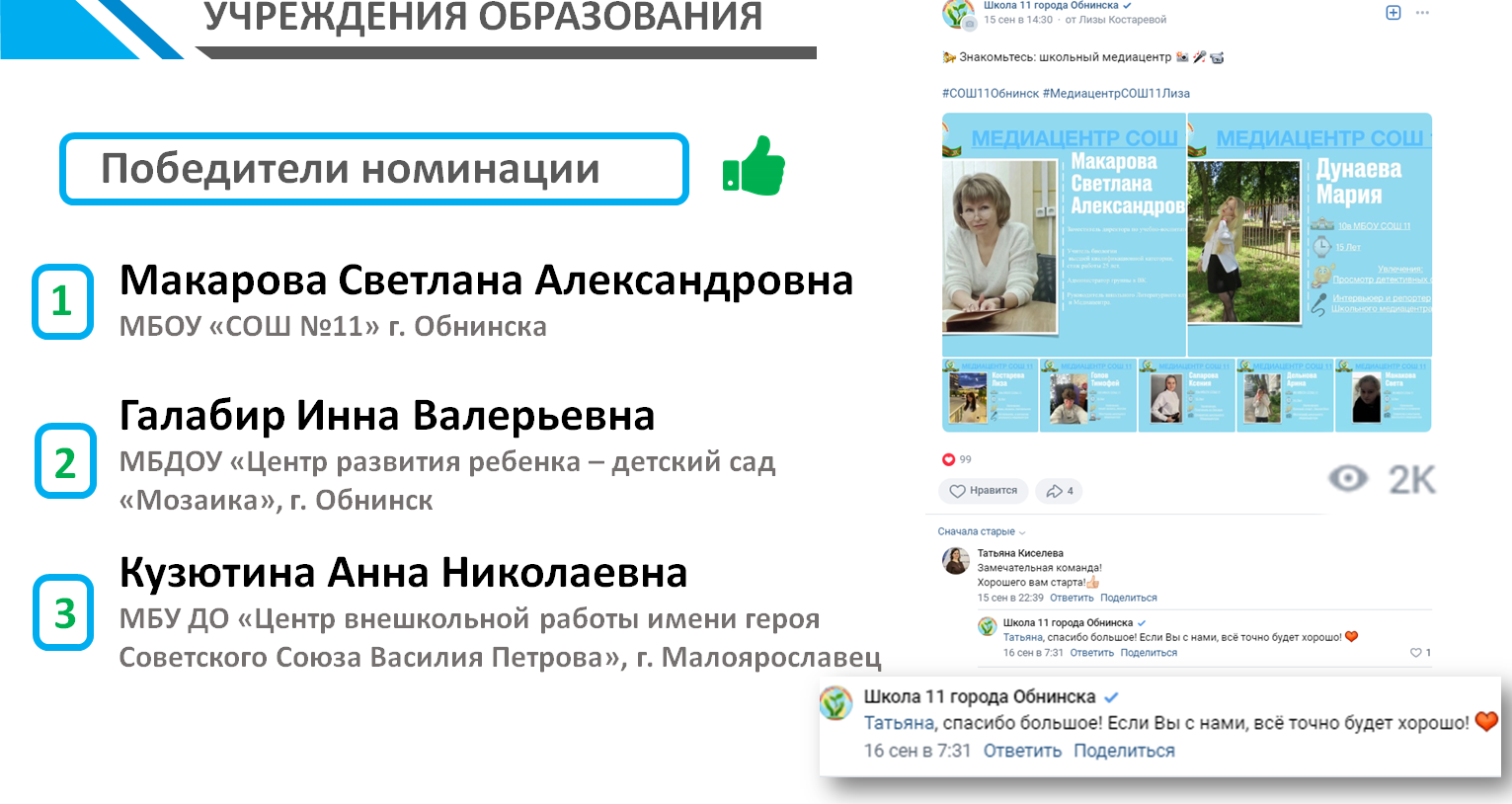 Лучшими специалистами по ведению Госпабликов в учреждениях образования стали Светлана Макарова, заместитель директора по УВР обнинской школы №11 им. Подольских курсантов (1 место в номинации), и Инна Галабир, заведующий обнинским детским садом «Мозаика» (2 место в номинации). Лучшим специалистом по ведению Госпабликов в учреждениях спорта стала Ирина Кийко, специалист обнинской СШОР «Олимп» (1 место в номинации). Благодарностью Губернатора Калужской области за высокий профессионализм и значительный вклад в развитие Госпабликов Калужской области отмечена руководитель пресс-службы Администрации Обнинска Елена Журавлёва.