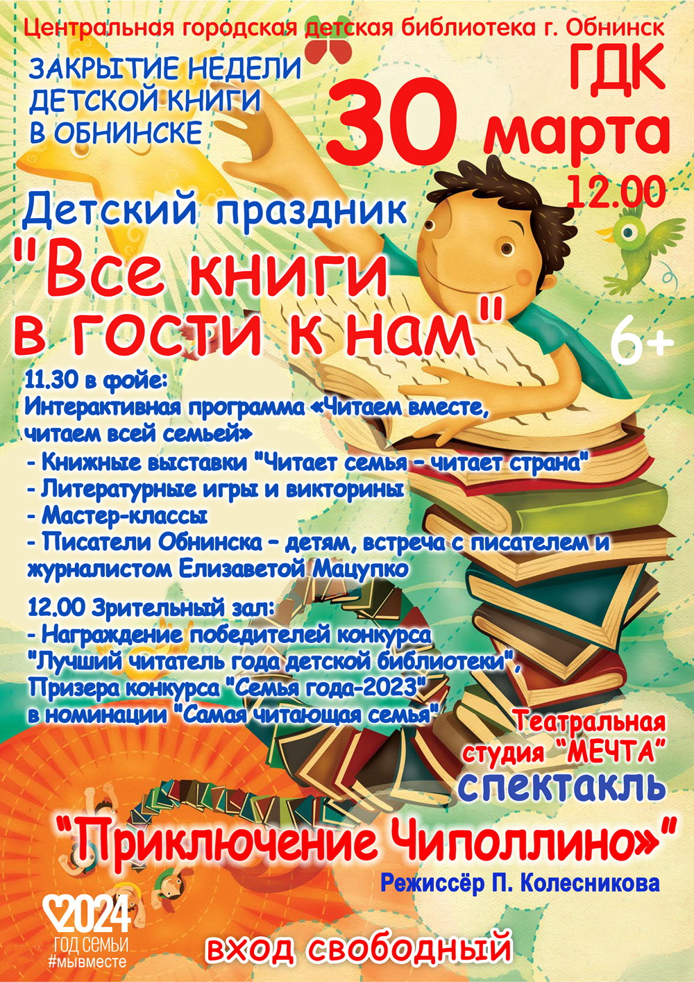 30 марта в 11-30 Детские библиотеки города и Городской Дворец Культуры приглашают юных читателей и их семьи на закрытие недели детской книги «Книжкины именины» (6+).