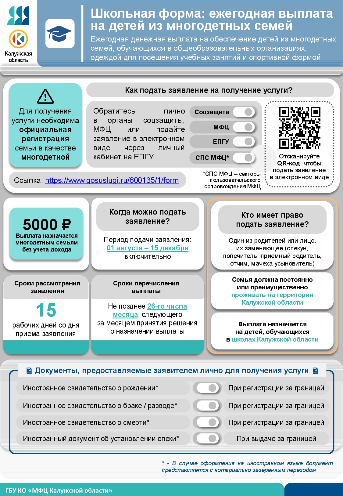 В Калужской области с 1 августа по инициативе губернатора начнёт действовать новая региональная мера социальной поддержки для детей из многодетных семей. Так, предусмотрена ежегодная выплата на детей, обучающихся в общеобразовательных организациях, для покупки школьной и спортивной формы. Ее размер составит 5 000 рублей и будет ежегодно индексироваться. Прием заявлений начнется с 1 августа и продлится до 15 декабря.