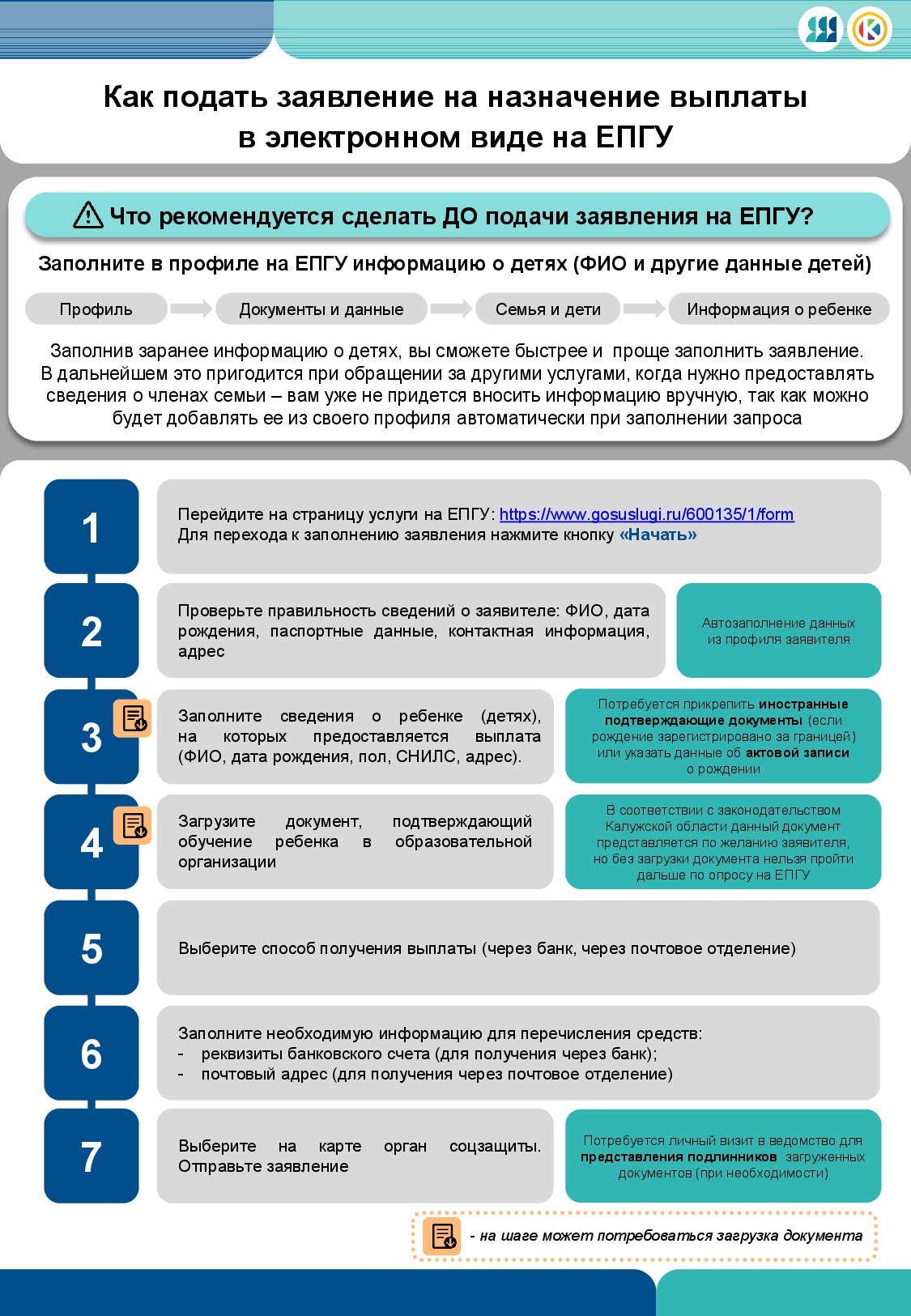 Подать заявление можно в Управление соцзащиты или МФЦ. Также сейчас ведутся работы для того, чтобы в будущем заявление можно было подавать через Госуслуги. Из документов гражданам понадобятся: паспорта, СНИЛС, свидетельства о рождении детей и реквизиты счёта. Еще одно условие – дети должны обучаться на территории Калужской области.