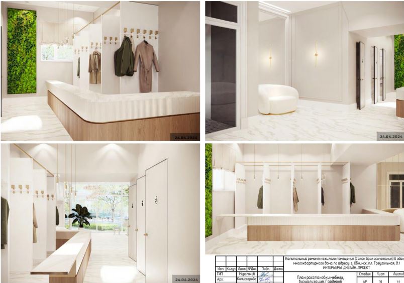 В плане дальнейших работ: зашивка стены в холле для скрытия коммуникаций; монтаж инсталляций в санузлах; подвод водоснабжения в кухонной зоне персонала; зашивка подиума фанерой с последующей зашивкой кварцвинилом; укладка настенной и напольной плитки в помещениях; монтаж подвесного и натяжного потолка; монтаж настенной лепнины; покраска стен; монтаж дверей, системы вентиляции и финишной сантехники, электрики и систем освещения, замена витражей.