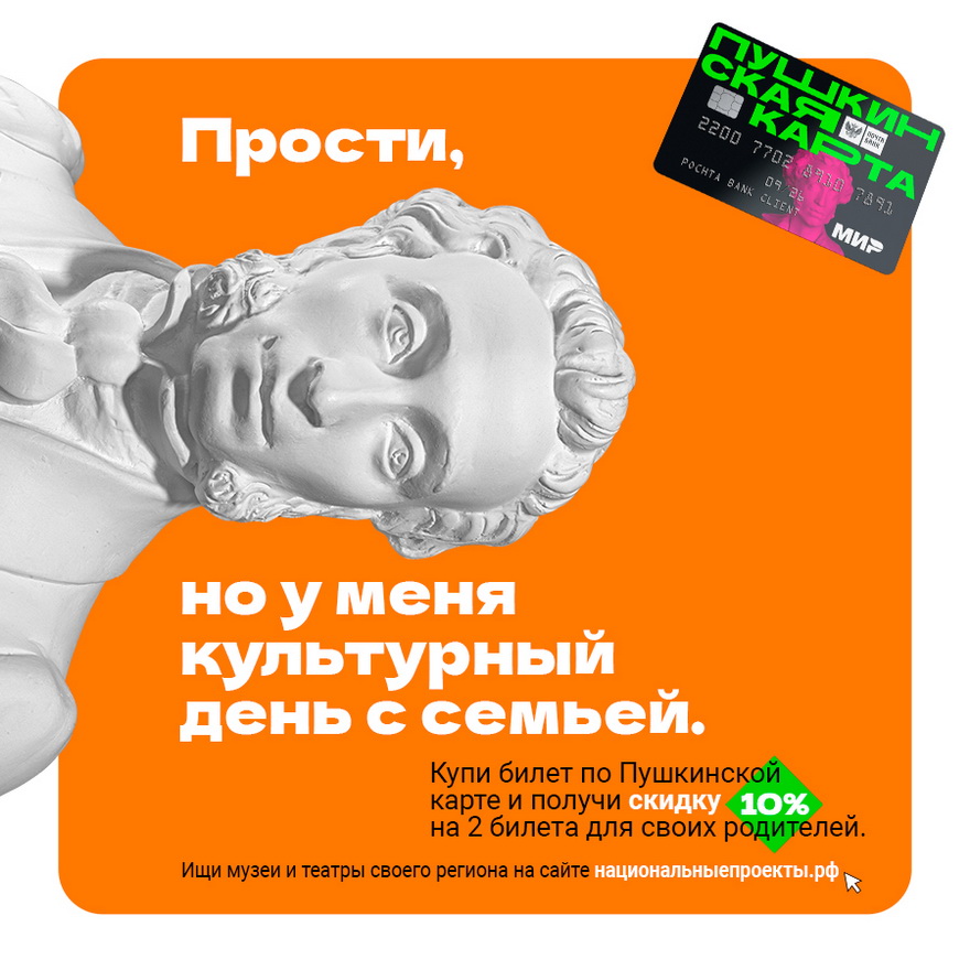 По данным АНО «Национальные приоритеты», с 30 декабря 2024 года по 12 января 2025 года по всей стране пройдет уникальная акция для владельцев Пушкинской карты - «Веди родителей в музей». Теперь при покупке билета по Пушкинской карте посетитель сможет получить скидку 10% на покупку двух билетов для своих родителей. Такая возможность появится в более тысячи учреждений культуры России.