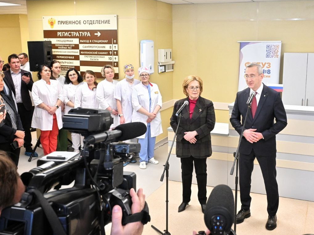 Открывая отделение, Вероника Скворцова отметила: «Сегодня мы открываем приёмное отделение, которое будет работать во всех возможных форматах: оказывать экстренную, неотложную и плановую помощь. В отделении разделены потоки, чтобы максимально комфортно, быстро, без промедления оказывать медицинскую помощь. Прием организован таким образом, чтобы минимизировать риски передачи инфекций и отделять пациентов с подозрением на инфекционные процессы. Для приёмного отделения важнейший показатель – временной, так называемое время «от двери до иглы», когда нужно очень быстро провести углубленную диагностику, выявить причину заболевания и сразу же правильно начинать лечить, включая реанимационные противошоковые мероприятия. Очень важно, что внутри приёмного отделения есть все необходимые диагностические методы, круглосуточная служба, и врачебная, и среднего медицинского персонала, и младшего медицинского персонала. Есть возможность быстрого привлечения узких специалистов из стационара».