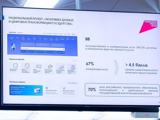 Национальный проект «Экономика данных и цифровая трансформация государства». Показатель «Доля российского программного обеспечения, используемого в деятельности органов государственной власти субъектов Российской Федерации» составил 70 %. Обеспечена доступность 88 наиболее востребованных государственных и муниципальных услуг (МСЗУ) в электронном виде на портале Госуслуг. 800 тысяч калужан имеют подтвержденную учетную запись на Госуслугах, около 35 тысяч зарегистрировались на портале с начала этого года. Уровень удовлетворенности жителей качеством предоставления выше 4,5 баллов (по 5-балльной системе) получили 67 % электронных услуг (выше уровня в целом по России на 9 %).