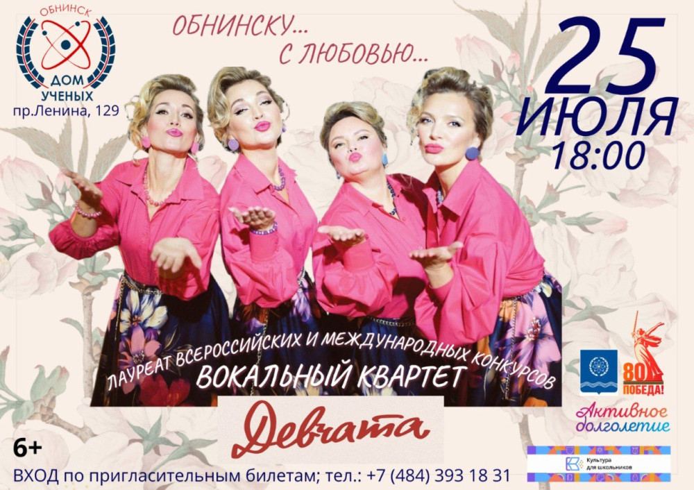 25 июля, 18:00 Концертная программа вокального квартета «Девчата». Вход по пригласительным билетам. Пригласительные билеты в кассе Дома учёных