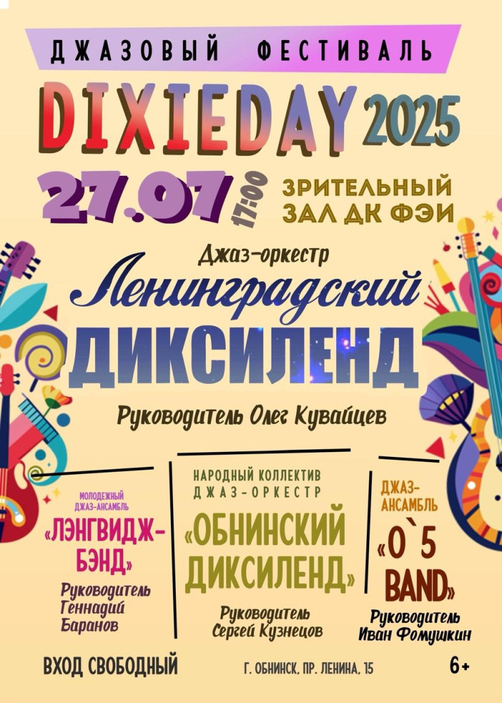 27 июля, 17:00 Концертный зал. Джазовый фестиваль «DIXIEDAY`2025». В программе: Обнинский Диксиленд, Лэнгвидж Бэнд, джаз-квартет «Ретро», О`5 BAND. Специальный гость: «Ленинградский диксиленд» (г. Санкт-Петербург) под руководством Заслуженного артиста России Олега Кувайцева