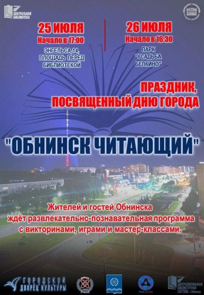 25 июля, 17:00 Праздник «Обнинск читающий». Развлекательно-познавательная программа с викторинами, играми и мастер-классами