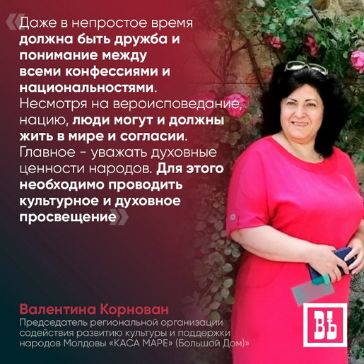 «Даже в непростое время должна быть дружба и понимание между всеми конфессиями и национальностями. Несмотря на вероисповедание, нацию, люди могут и должны жить в мире и согласии. Главное – уважать духовные ценности народов. Для этого необходимо проводить культурное и духовное просвещение», - подчёркивает председатель региональной организации содействия развитию культуры и поддержки народов Молдовы «Каса Маре (Большой дом)» Валентина Корнован.
