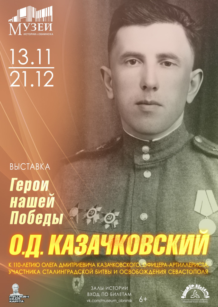 13 ноября в 17:00 в Музее истории города Обнинска состоится открытие выставки «Герои нашей Победы. О.Д.Казачковский». Выставка посвящена 80-летию Победы в ВОВ 1941-1945 гг. и 110-летию со дня рождения Почётного гражданина Обнинска, боевого офицера и учёного-физика Олега Дмитриевича Казачковского.