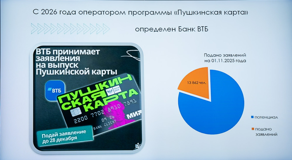 Предваряя его обсуждение, глава региона отметил, что по решению Президента России с сентября 2021 года реализуется социальная культурная программа «Пушкинская карта». В этом году она вошла в национальный проект «Семья». Программа позволяет молодым людям бесплатно посещать спектакли, выставки, экскурсии, концерты и, тем самым, способствует привлечению молодёжи к изучению культуры, искусства, истории. Помогает подрастающему поколению приобщиться к ценностям отечественной и мировой культуры, повышает общий уровень культурного развития школьников и студентов.